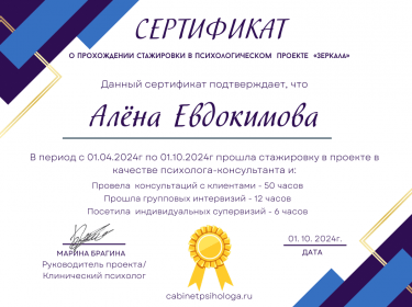 Мой путь в психологию — это история непрерывного поиска, обучения и развития. Я глубоко убеждена в том, что каждый из нас способен на изменения и рост, и я здесь, чтобы поддержать вас на этом пути.